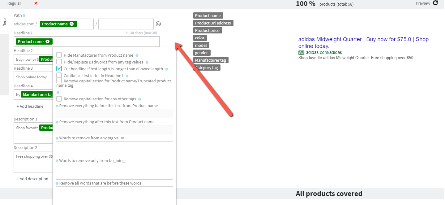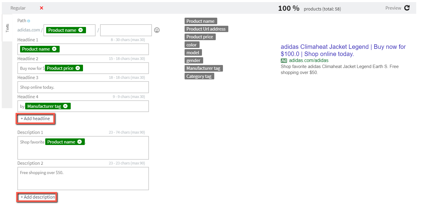 En anden vigtig forskel er, at du nu får individuelle indstillinger for hver overskrift, mens du i en almindelig annonce kun kan ændre i hele skabelonen.